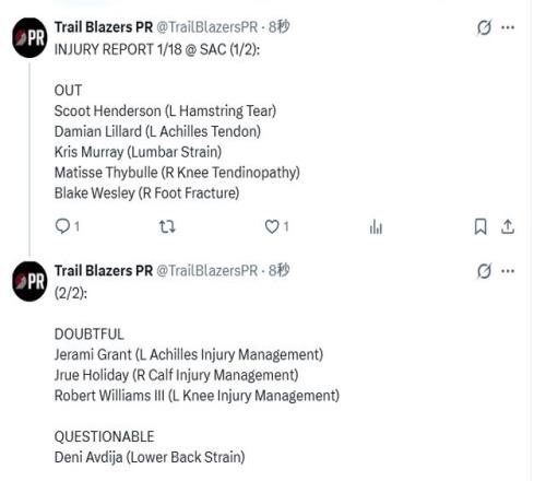 北京时间1月19日,开拓者官方更新了今日背靠背对阵国王的伤病报告,格兰特和罗威都是大概率缺战,杨瀚森预计会获得更多出场时间。另外,此前伤停的阿夫迪亚的状态升级为出战成疑,有望复出。对于瀚森来说,这也是利好,阿夫迪亚是愿意给瀚森传球的队友。
