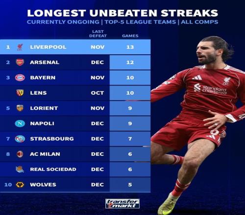 德国转会市场网站列出了五大联赛球队目前仍在持续中的各项赛事最长不败排行,利物浦以13场不败居首,阿森纳12场不败列第二。