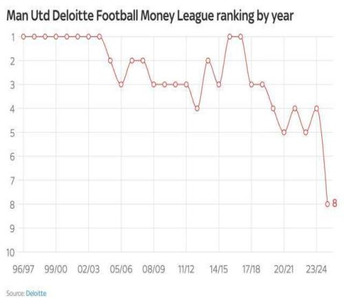 弗格森退休后,曼联经过多年“努力”,获得了“人傻钱多”的标签,但现在钱还多不多真要另说了。最近公布的德勤足球金钱联赛排名,曼联上季收入跌到了历史最低的第8,排在利物浦、曼城和阿森纳之后。曼联曾被视为足球商业成功的典范,在迄今的29届金钱联赛榜中10次位居榜首,但最近一次登顶已经是2017年了。