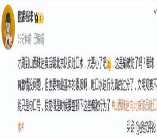 山西现场球迷对北京球员吐口水引热议!陈盈骏妻子怒斥不文明行为